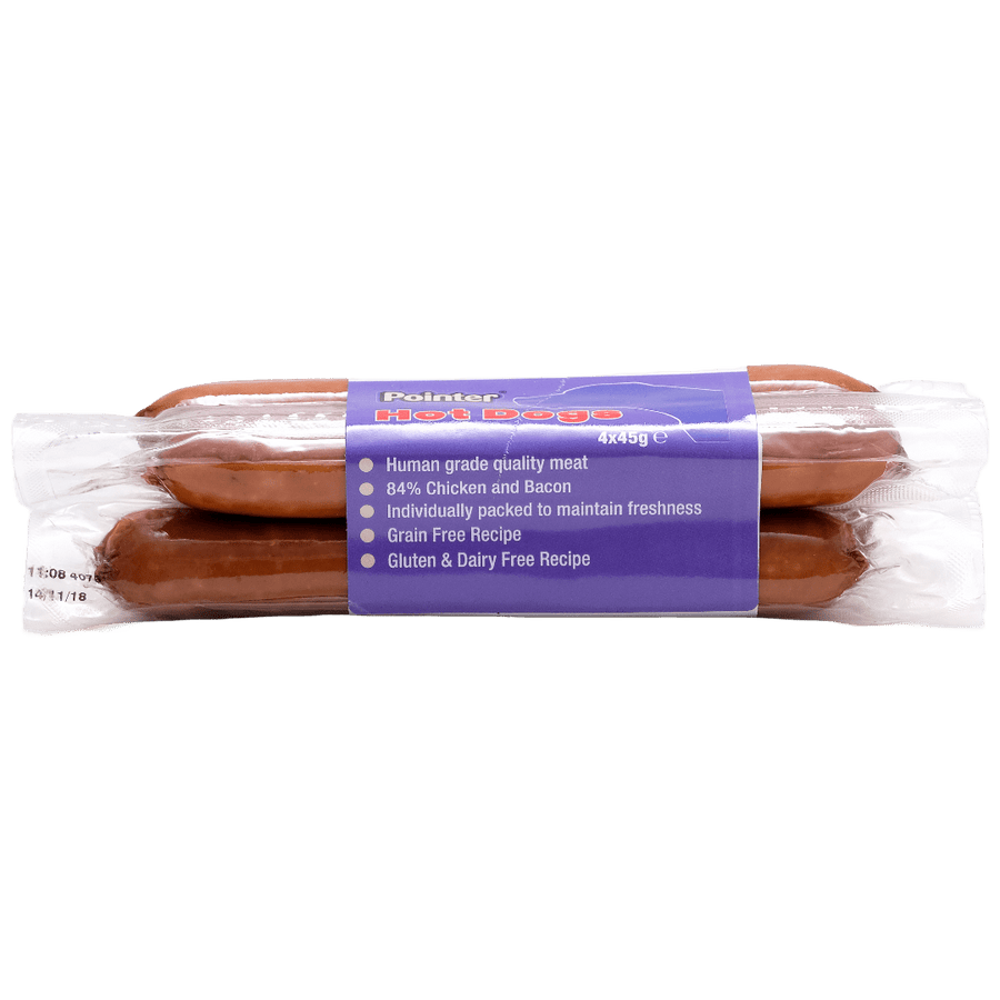 Delicious grain free meaty treat for dogs. A popular dog treat in the Pointer range of treats. A complementary pet food for dogs. Human grade quality meat 84% Chicken and bacon Individually packed to maintain freshness Naturally grain free recipe Gluten and dairy free recipe.