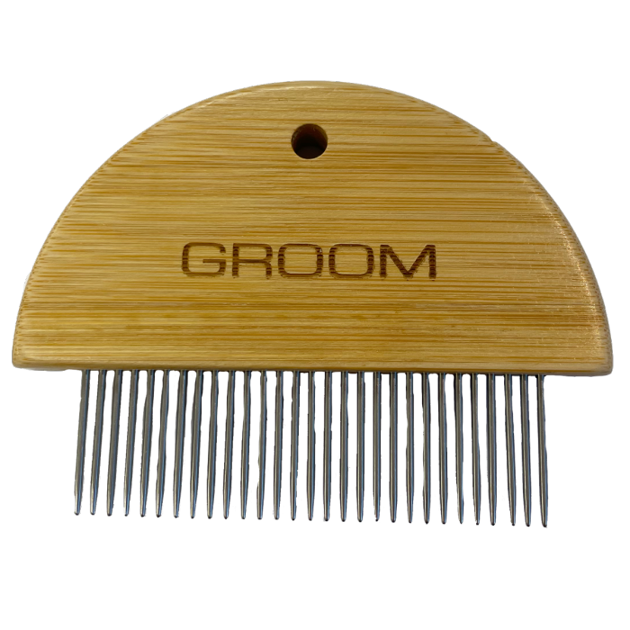 Our Bamboo Eco Groom range has been developed using bamboo materials. Better for the planet, this Eco range features a range of ergonomic grooming products for pets. This Bamboo Comb is suitable for all breed and coat types, but it ideal for short to medium hair. Regular combing with this Bamboo Comb keeps medium to long and thick coats free from tangles, knots and matts. This Bamboo Comb has durable stainless steel round edge pins to protect the skin and has been ergonomically designed with a comfort grip handle. Directions: Comb in the direction of the hair growth, combing small sections at a time until the coat is tangle free.