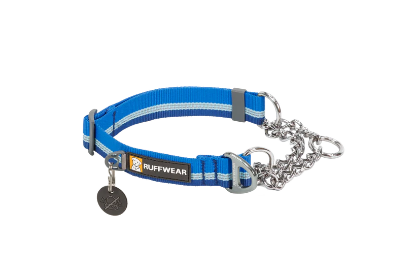 The Chain Reaction Collar is a martingale collar with chain. It combines reflective Tubelok™ webbing and a short section of stainless steel chain. The limited-cinch martingale design is popular among dogs who have a knack for slipping out of traditional collars. Packed full of Ruffwear’s signature collar features: separate ID tag attachment point, a silicone tag silencer, and strong and comfortable webbing that holds its color.