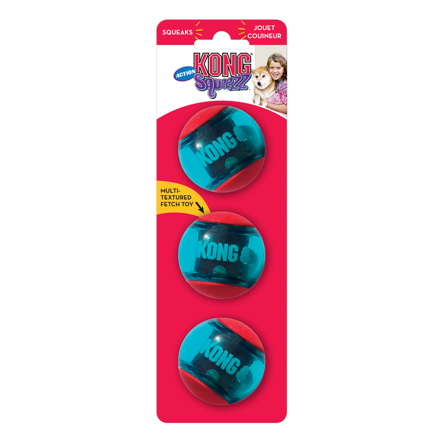 Dogs love chasing after the wild bounce that comes from the new KONG Squeezz Action Shapes featuring dynamic rubber and fun shapes that make games of fetch way more fun. Vibrant, multi-textured, grippy balls beg for chewing and chomping with each squeeze delighting dogs from the added squeakers safely embedded within the toy.